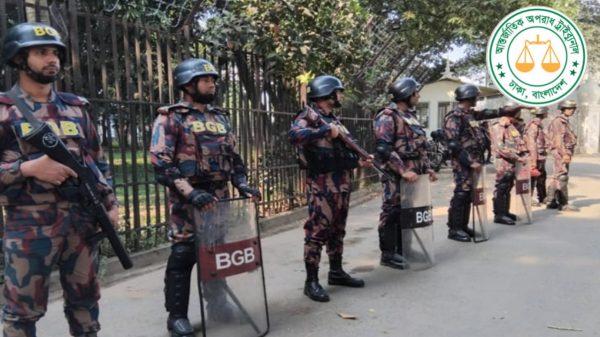 মানবতাবিরোধী অপরাধের একটি মামলায় মোট ১৩ জন আসামি কে কড়া নিরাপত্তার মধ্যদিয়ে হাজির করা হয়েছে।