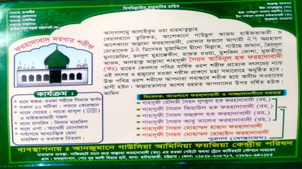 মুজাদ্দিদে দ্বীনো মিল্লাত, গাউছে জামান, ছৈয়দুল মুনাজেরিন, ছনদুল মুহাব্বেকীন, হাজত রওয়া মুশকিল কোশা, মুফতীয়ে আজম, আলহাজ্ব আল্লামা শাহসূফী সৈয়দ আমিনুল হক ফরহাদাবাদী (কঃ) ছাহেব কেবলার পবিত্র বার্ষিক ওরশ শরীফ