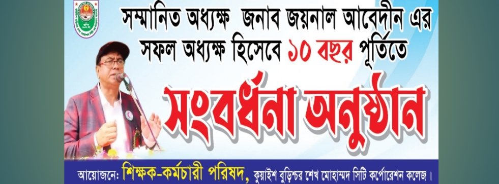 কুয়াইশ বুড়িশ্চর শেখ মোহাম্মদ সিটি কর্পোরেশন কলেজ এর সম্মানিত অধ্যক্ষ জয়নাল আবেদীন সাহেবের সফল অধ্যক্ষ হিসেবে দশ বছর পূর্তিতে কলেজের শিক্ষক - কর্মচারী পরিষদের পক্ষ থেকে রইলো আন্তরিক শুভেচ্ছা ও অভিনন্দন জানিয়েছেন।