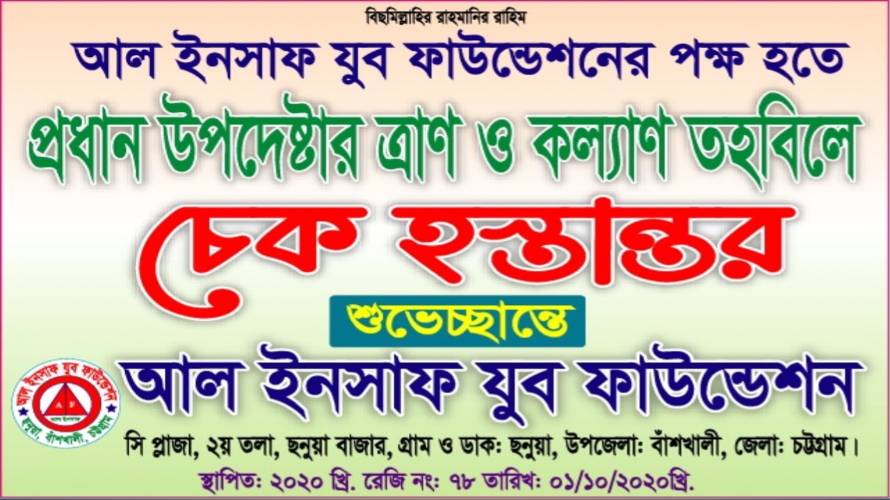 আল ইনসাফ যুব ফাউন্ডেশন বন্যার্তদের সহায়তার জন্য প্রধান উপদেষ্টার ত্রাণ ও কল্যাণ তহবিলে জমা দানের জন্য উপজেলা নির্বাহী অফিসার বরাবর চেক প্রদান করা হয়। উপজেলা নির্বাহী অফিসারের অনুপস্থিতিতে উপজেলা নির্বাহী অফিসারের প্রশাসনিক কর্মকর্তা চেক গ্রহণ করেন। সার্বিকভাবে সহযোগিতা করেন উপজেলা যুব উন্নয়ন কর্মকর্তা জনাব শওকতুজ্জামান মহোদয়।