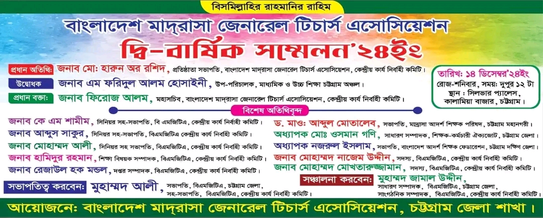 বাংলাদেশ মাদরাসা জেনারেল টিচার্স এসোসিয়েশন, চট্টগ্রাম জেলা শাখার উদ্যোগে আজ ১৪ ডিসেম্বর আড়াইটায় চট্টগ্রাম নগরীর কালামিয়া বাজার সিলভার প্যালেসে এ সম্মেলন অনুষ্ঠিত হয়। বিএমজিটিএ চট্টগ্রাম জেলা শাখার সভাপতি মুহাম্মদ আলীর সভাপতিত্বে ও সাধারণ সম্পাদক মুহাম্মদ জামাল উদ্দীনের পরিচালনায় প্রধান অতিথি হিসেবে উপস্থিত ছিলেন বাংলাদেশ মাদরাসা জেনারেল টিচার্স এসোসিয়েশন, কেন্দ্রীয় কার্য নির্বাহী কমিটির প্রতিষ্ঠাতা সভাপতি মোঃ হারুন অর রশিদ।