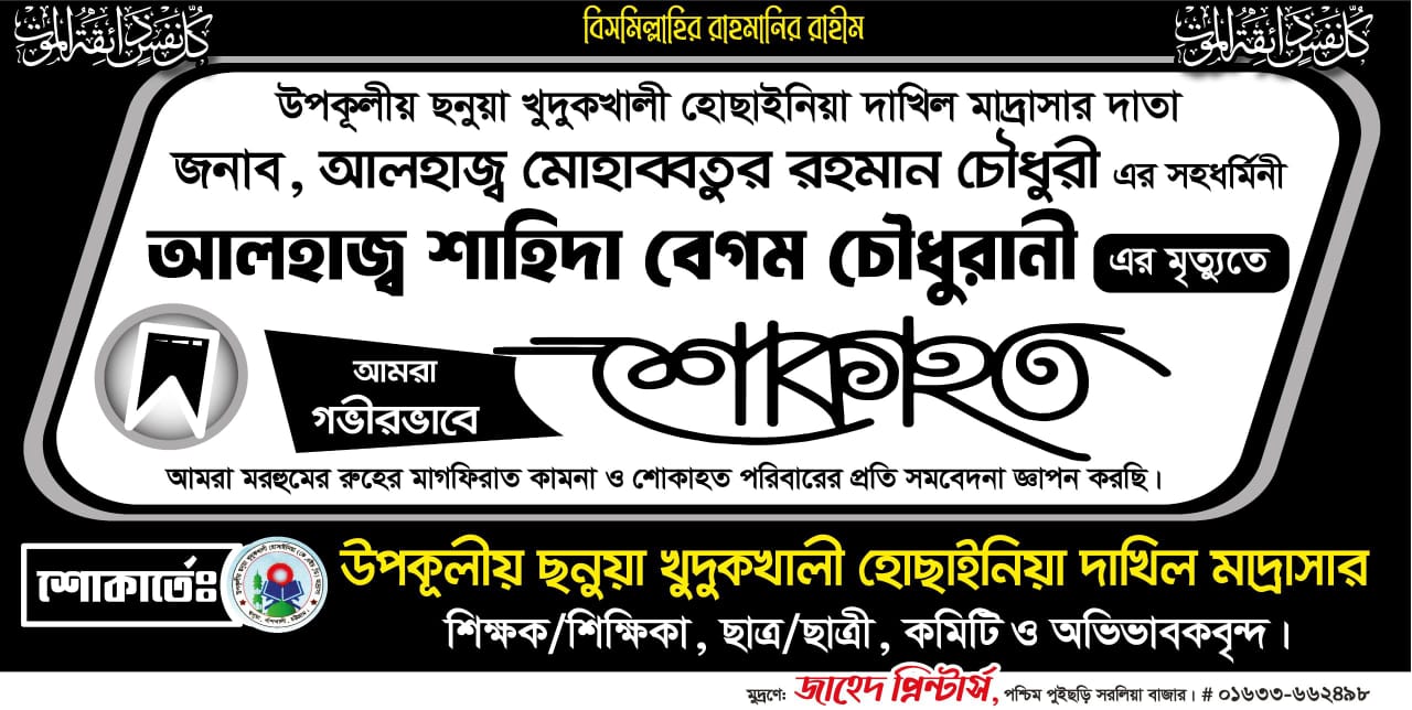 আলহাজ্ব শাহিদা বেগম চৌধুরী আলহাজ্ব মোহাব্বতুর রহমান চৌধুরীর সহধর্মিণীর ইন্তেকালে আমরা গভীর ভাবে শোকাহত।