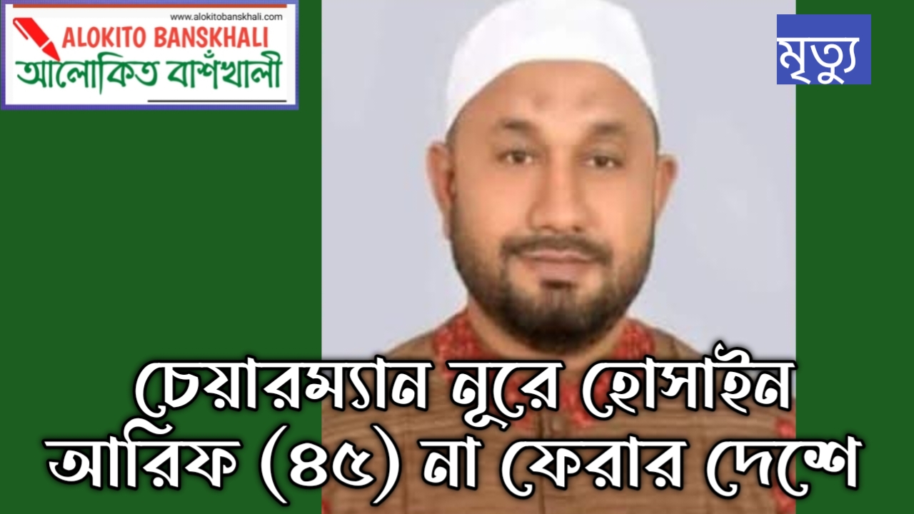 কক্সবাজারের চকরিয়ায় বদরখালী ইউনিয়ন পরিষদের চেয়ারম্যান ও ইউনিয়ন আওয়ামী লীগ সভাপতি নূরে হোসাইন আরিফ (৪৫) মারা গেছেন (ইন্না লিল্লাহি ওয়া ইন্না ইলাইহি রাজিউন)। মঙ্গলবার বিকেলে চট্টগ্রামের একটি প্রাইভেট হাসপাতালে চিকিৎসাধীন অবস্থায় হৃদযন্ত্রের ক্রিয়া বন্ধ হয়ে তিনি মারা যান। কয়েকদিন আগে হার্টে ব্লক ধরা পড়লে রিং পরানো হয়েছিল।